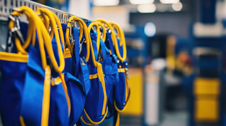 This image showcases a professional industrial workspace with safety gear arranged neatly on hooks, including helmets, jackets, and vests for effective organization.
