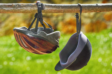 Two Jockey Helmets Hanging on the Beam