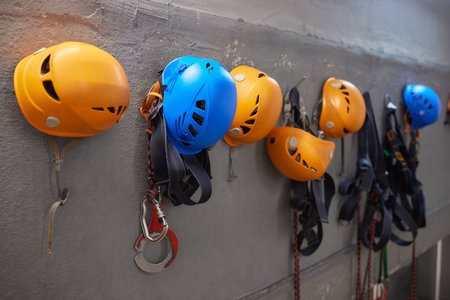 A row of safety helmets hanging on a wall. The helmets are of different colors and sizes. Concept of safety and caution, as the helmets are meant to protect workers from potential hazards