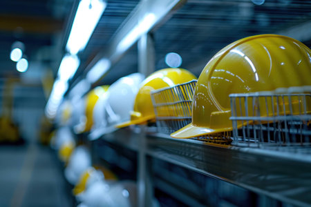 Yellow and white safety helmets neatly arranged on industrial shelves in a dimly lit factory. Safety and construction materials concept.