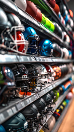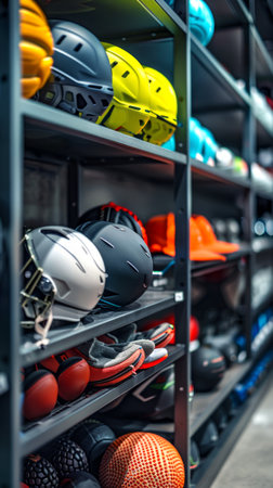 Shelves filled with various sports equipment including helmets and balls. Concept of athletic gear, sports store, exercise accessories, fitness equipment. Vertical.