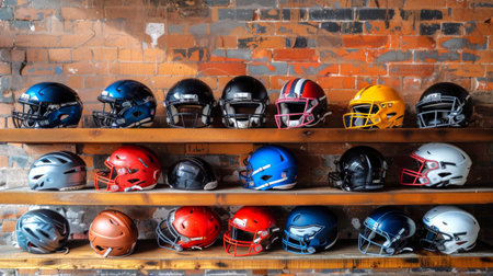 Collection of football helmets and a rugby ball on wooden shelves against a brick wall in a locker room . Concept of sports gear, safety helmets, storage display, athletic equipment.
