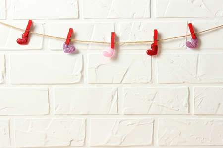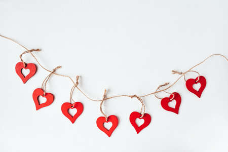 Valentines day decoration with ornaments in the form of hearts. White wooden background.