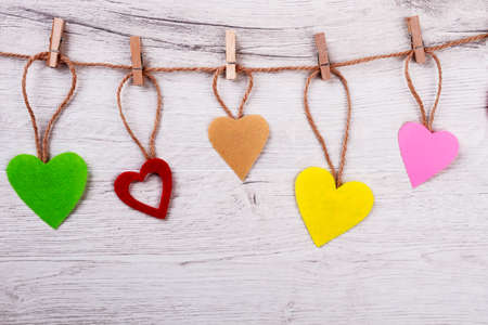 Colorful Hanging Wooden Hearts Decoration, Love, Romance, and Valentine s Day Background