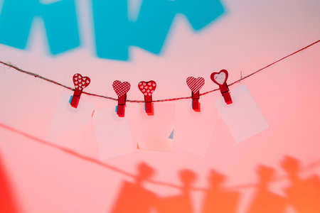 5 white pieces of paper red clothespins with a heart on a rope with a shadow. Valentine's Day love. blue-pink background. copy space. mocap