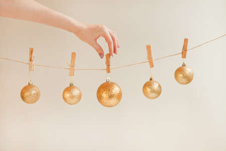 hand pinning golden decoration balls on rope. Christmas baubles and ornaments balls set on white