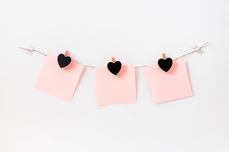 Craft hearts wooden black chalkboard clothespins on rope twine on white wall with pink paper note, horizontal. Garland decoration. Postcard for Valentines day or wedding party