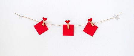 Garland with heart pins and red paper memo on rope twine on white wall, banner format. Decorations for Valentine's Day, Wedding Party