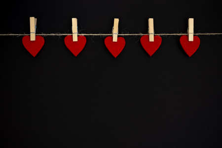 Red heart hanging on the clothesline. Handmade blank for greeting card, isolate on black background. Valentines day