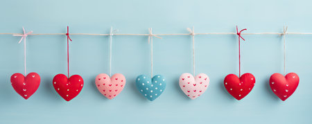 Gingham love hearts on pastel light background. Blue wall with heart shape garland. Valentines day concept with copy space. Greeting card or banner