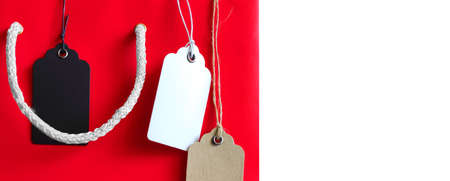 Red and brown paper tags hanging on the rope with copy space isolated on white background.