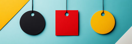 Black, Red And Yellow Tags Against Minimalist Blue Background, Copy Space., Sale And Retail Concept.