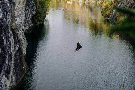 A man jumping from a bungee over a canyon in the Ruskeala mountain park in Karelia, Russia