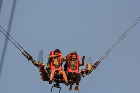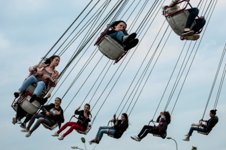 Amusement park attractions. Group of people having fun on a swing.