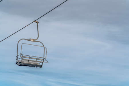 Empty chair lift covered with snow against sky. An empty shair lift isolated against a vast cloudy sky in Park City, Utah. The seat of the ski lift is covered with a thick layer of frosty snow.