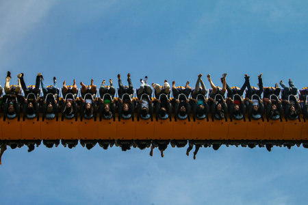 A spectacular thrill ride, the TORNADO, at an amusement park in DUFAN, Jakarta. Riders are suspended upside down, with their feet and shoes pointing towards the bright blue sky.