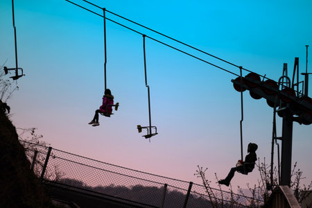Adventurous Zipline Ride Silhouetted Against Dramatic Sunset Sky.