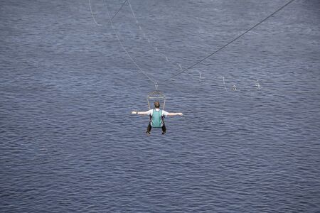 Rear view of young man riding on zip line against a background of a blue river water wave, Kyiv, Ukrainee