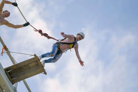 Belarus, Gomel, March 08, 2019. Jumping from the bridge to the rope.Ropejumping.Dangerous hobbies.Brave woman jumping from the bridge against the sky