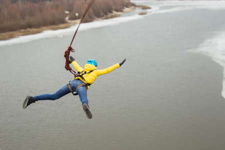 Belarus, Gomel, March 08, 2019. Jumping from the bridge to the rope.Ropejumping.Woman jumping from a high bridge on a rope