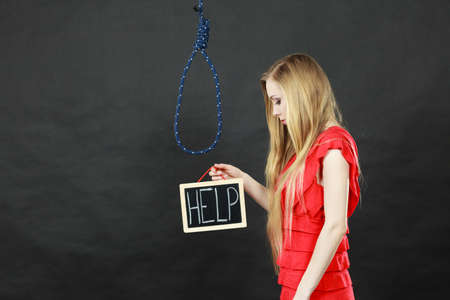 Suicidal skinny woman wearing elegant red dress holding help sign on dark board next to hanging rope with knot.