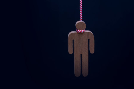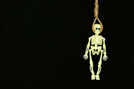 Suicide and depression concept. figurine of a man in a loop and the inscription suicide on a black background. toned.