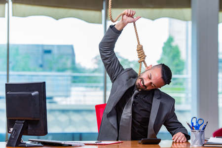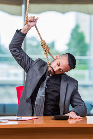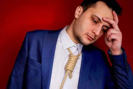 Portrait of man in blue suit with Lynch loop instead of tie over neck. symbol of overwork, excessive stress and psychological strain. businessman is depressed and desperate. Suicidal mood.