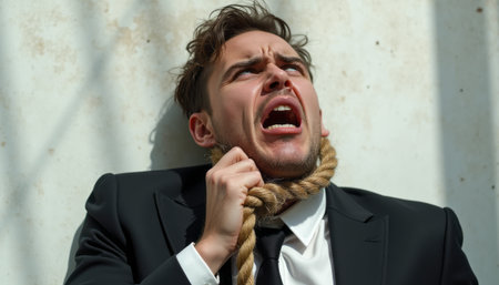 Experience the weight of corporate stress as a tied businessman struggles with worry, embodying the pressure of modern work life.