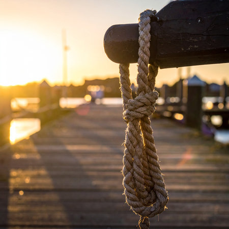 A nautical rope tied in a noose knot hangs on a pier at sunset with sun flare. Clear details and vibrant colo...