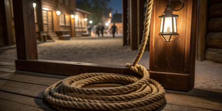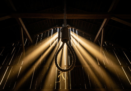 A dramatic, low angle view of a thick rope noose hanging in a dark, dusty interior. intense shafts of light pierce the gloom, highlighting the texture of the rope.