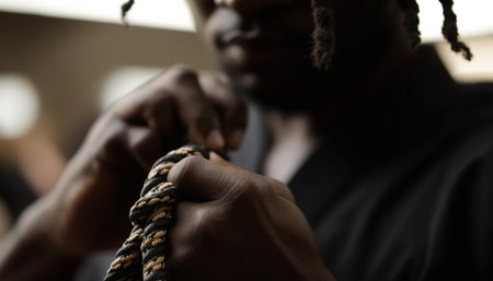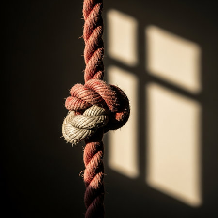 A close-up of a hand gripping a thick rope tied with a secure knot, conveying strength
