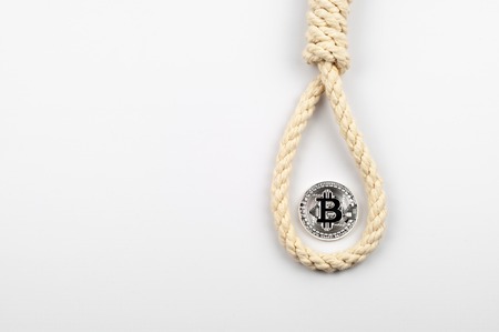 falling bitcoin, the concept of a symbol of a coin in a loop of rope in white background