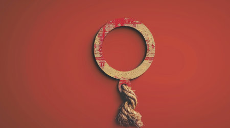 Conceptual image featuring a textile and wooden ring against a vibrant red background, symbolizing gender equality and unity.