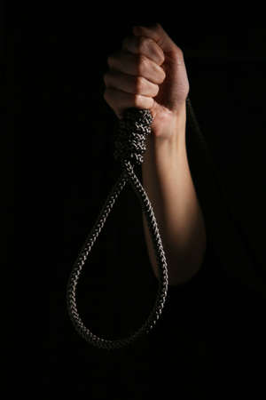 Hand holds a noose on a black background. Social problem. The end of the path