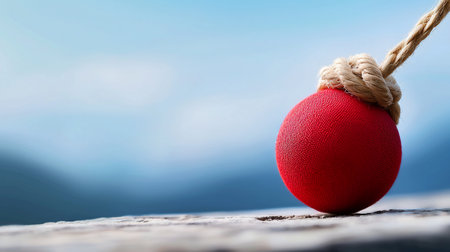 A vibrant red, fabric-covered sphere with a distinct woven texture, held by a thick, natural fiber rope tied in a tight knot.