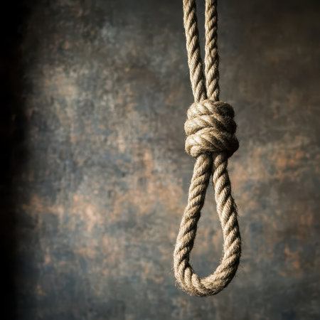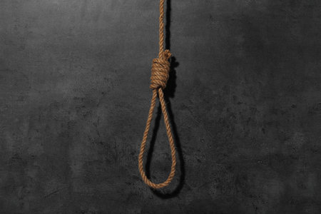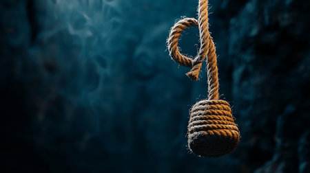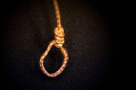 Rope noose with dark, shadowy background, tied in loop
