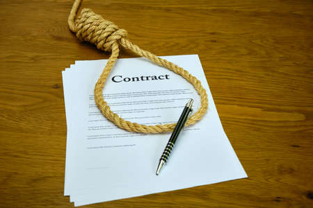 Contract with pen and rope tied in hangmans noose. Strangulation contract, unfair agreement.