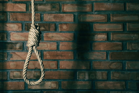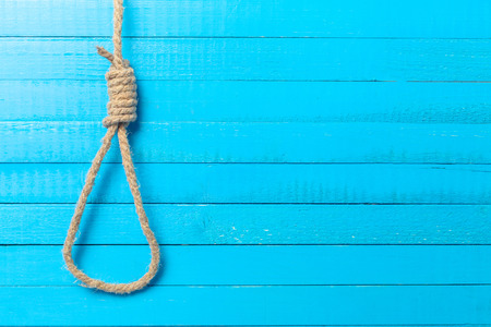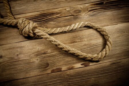 Hangman's knot on a rustic wooden table in a conceptual image of death penalty or suicide