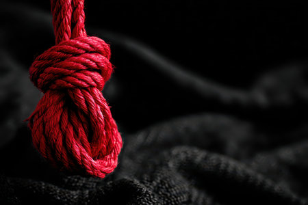 Frayed red rope hangs precariously by its last thread against a dark fabric background in a moment waiting for resolution