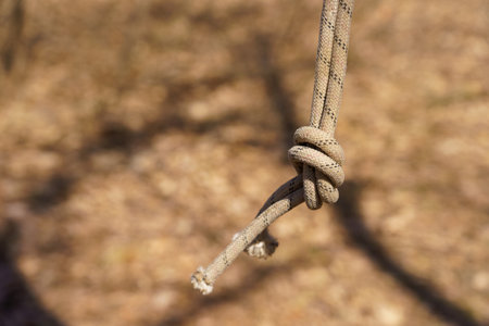 Close-up of a twisted rope knot on a textured surface, perfect for outdoor themes.