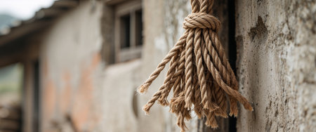 A knotted rope is positioned against a rough and degraded concrete wall showcasing a blend of earthy tones and textures. The natural fibers of the rope contrast with the faded backdrop creating a striking visual. The scene embodies a sense of calm yet evokes contemplation.