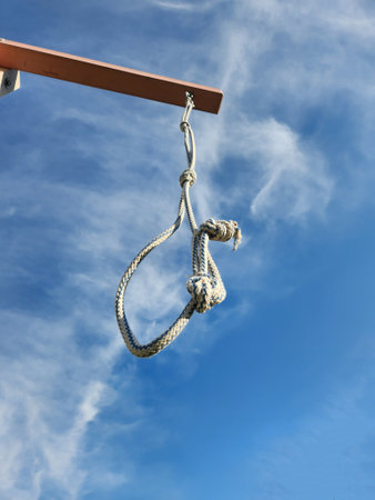 Noose from rope is suspended on gallows against blue sky with clouds. High quality photo