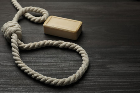 Rope noose and soap bar on dark wooden table