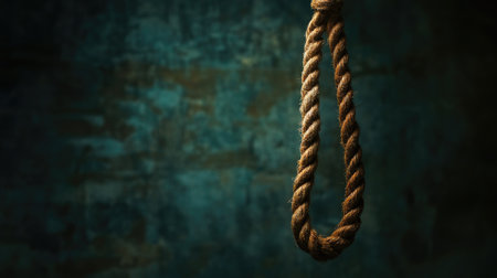A natural rope noose hangs from above positioned against a backdrop featuring a textured blue wall with peeling paint. The ambiance is somber and contemplative showcasing the intricacies of the knot and the rough texture of the rope