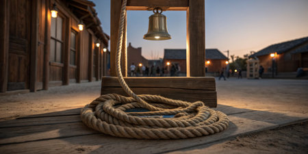 Golden light casts shadows on a worn bell and thick rope, evoking evening gatherings.