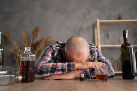 Alcoholism, depressed young man sleep on table while drinking alcoholic beverage, holding glass of whiskey alone at night. Treatment of alcohol addiction, suffer abuse problem alcoholism concept