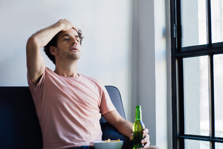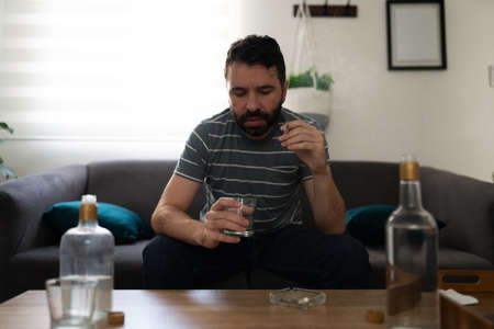 Alcoholic man looking sad smoking a cigarrete and drinking vodka alcohol, sitting in his home sofa alone