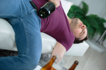 Drunk man on the sofa. concept of Alcoholism or alcohol addiction or drug addiction or depression. Unhealthy lifestyle.
