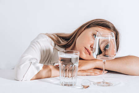 Portrait of a young brunette in refraction through glasses of water, face and pure water, concept