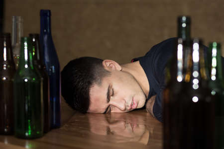 Drunk, young man sleeping on table, empty bottles next to him
